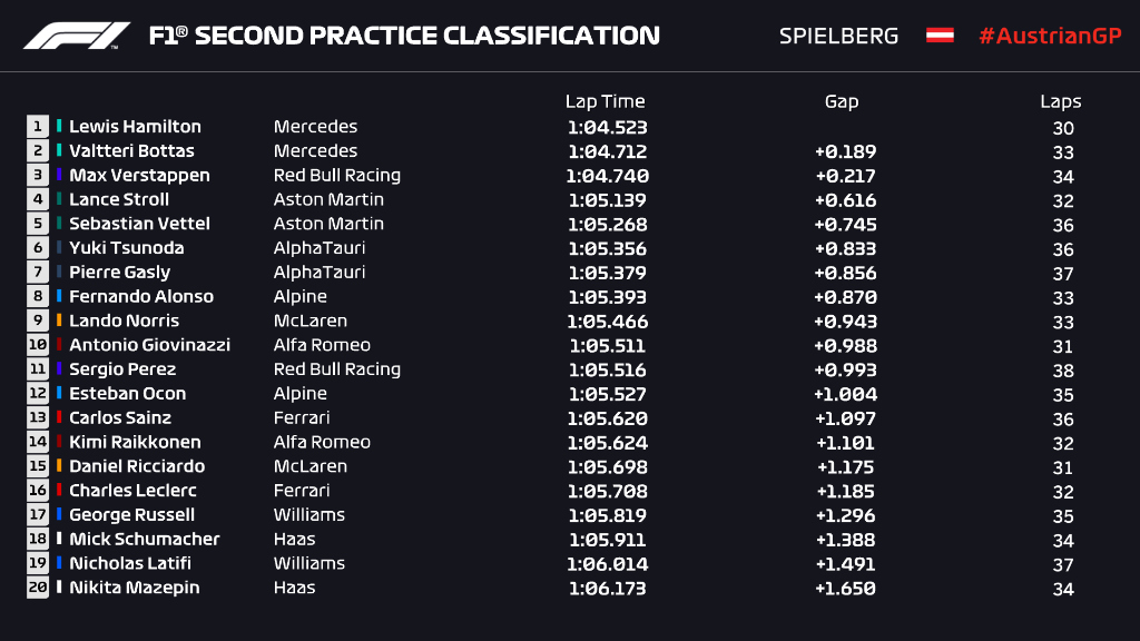 레드불 링 2연전 그 두번째입니다. 타이어 지정은 앞 GP때보다 한 단계씩 더 부드럽다지만 - 지난주 소프트 = 이번 주 미디움 - 큰 흐름은 별 차이 없을 거라는 예상이 일반적이었고 저도 그렇게 보았어요. 연습주행 때 타이어 테스트가 있기도 했습니다만 퍼포먼스나 기록에 영향 줄 만큼은 아니었던 것 같습니다. FP1에서 메르세데스가 잠시 주춤하는 듯 보였어도 FP2에서 곧바로 리더보드 맨 위 두 자리를 가져간 걸 보면, '어떻게든 하는' 노하우가 있는 것 같지요. FP3에선 다시 RBR의 0.5초 이상 페이스 우위가 돌아왔습니다만은.