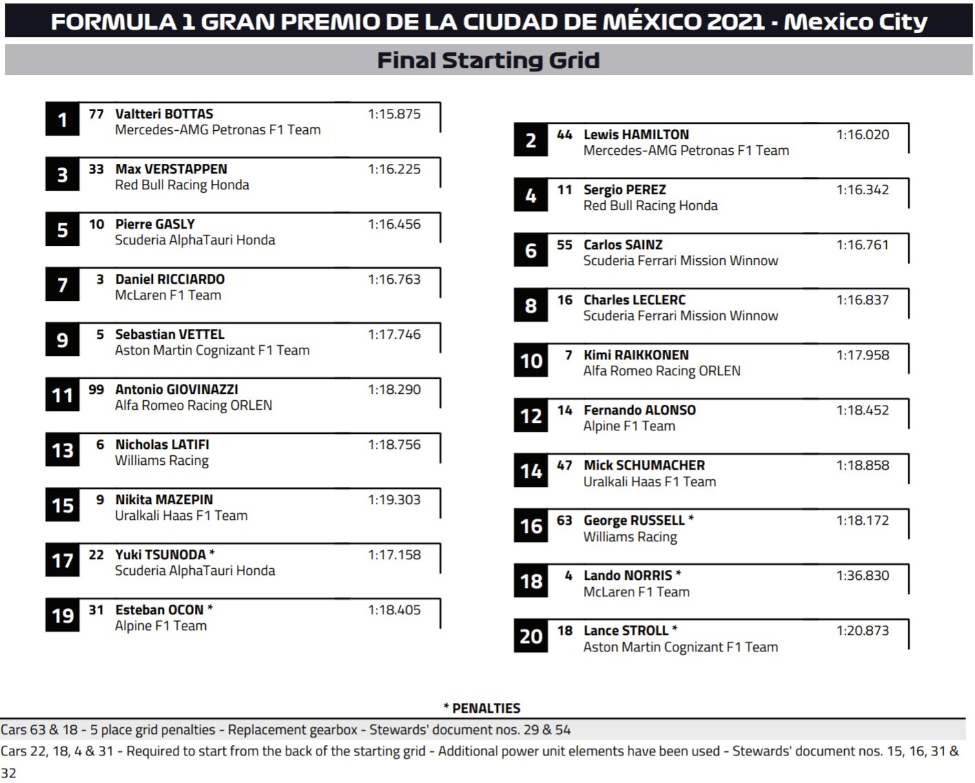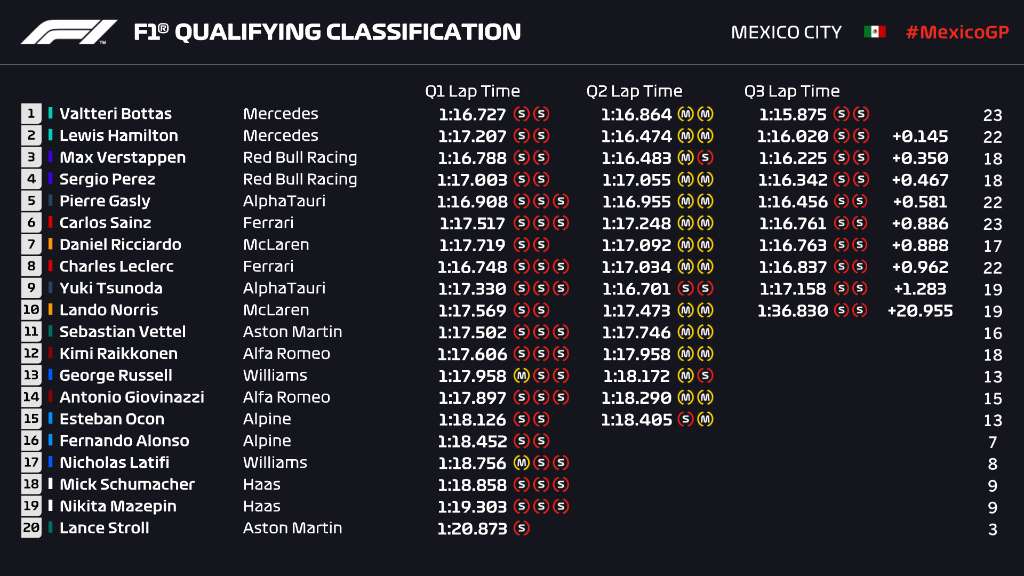 Q3에선 다섯 팀 열 드라이버의 경쟁 겸 팀 플레이가 시작부터 흥미로웠어요. 그리드 페널티 있는 드라이버가 팀메이트 끌어주기를 한다거나. Q3 첫 시도는 메르세데스의 보타스가 리드합니다. 팀메이트인 해밀튼보다 0.145초 앞섰고 RBR의 베르스타펜보다는 0.350초 앞섰는데, 연습주행 내내 RBR 우위 이어진 걸 감안하면 메르세데스의 이 페이스는 상당히 의외였습니다. Q3 두 번째 시도에서도 끌어주기 없이 보타스가 좋은 기록을 내며 예상 외의 메르세데스 첫 줄이 멕시코에서 이루어집니다. 턴10-11 즈음에서 알파타우리의 츠노다 유키가 실수, RBR의 페레스와 베르스타펜도 영향을 받으면서 베르스타펜의 두 번째 시도가 꼬인 걸 고려하면 토요일에만큼은 메르세데스에게 운이 더 따랐었는지도요. 폴 포지션은 보타스에게. 겸사겸사 판지오 상도 받아갑니다.