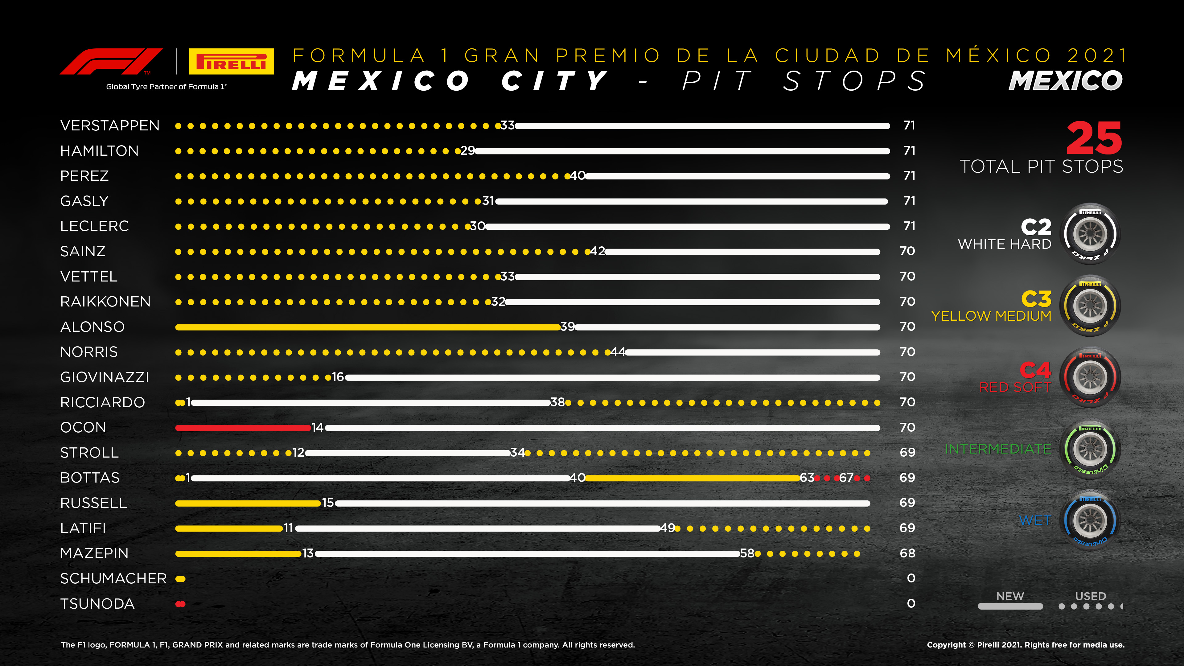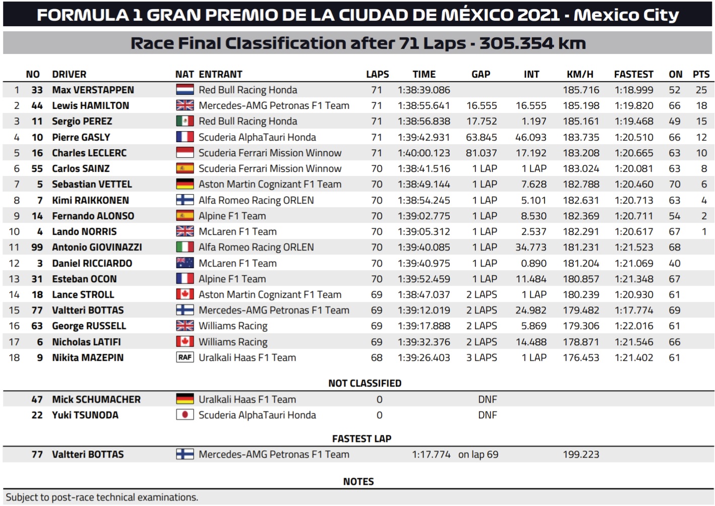 전날 메르세데스 프론트 로가 어떻게 가능했나 싶은 수준의 페이스 격차를 보이며 베르스타펜이 레이스를 리드하는 한편 p3 페레스를 상대로 한 p2 해밀튼의 버티기도 굉장했던 후반이었죠. L63/71 상황에선 p7 베텔부터 백마커. L65/71 보타스가 '플랜 F'를 시도합니다. 소프트 갈아신고 나왔지만 부족했는지 한 번 더, L70/71엔 어떻게든 해내는군요. 멕시코 GP의 새 랩 레코드이기도. 체커드 플랙, 우승은 베르스타펜, 포디움은 베르스타펜, 해밀튼, 페레스. 이것으로 멕시코 GP 시점까지 올 시즌 유일한 원투피니시는 맥라렌뿐이라는 재미있는 기록도 그대로 이어집니다. :)