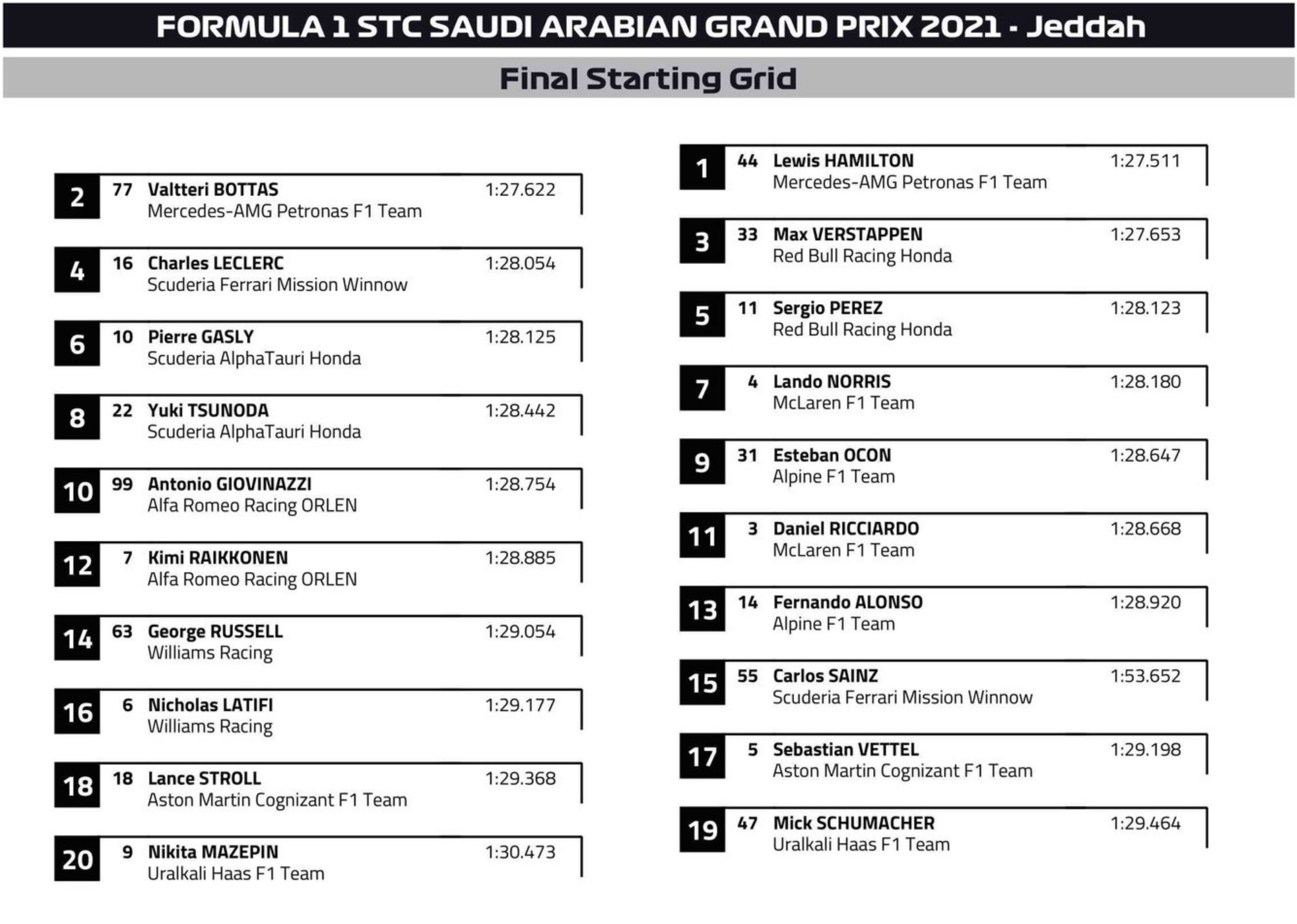 문제는 체커드 플랙 이후였는데, 레드불 레이싱의 막스 베르스타펜이 Q3 2차 시도에서 섹터 1, 2를 모두 퍼플로 마무리했지만 마지막 코너에서 벽에 부딪히면서 폴 포지션이 해밀튼에게. 올 섹터 패스티스트로 베르스타펜 폴이겠거니 했는데 27개 코너 중 27번째에서 사고가 날 줄 누가 알았을까요. 이번 제다처럼 좁은 트랙 아니었다면 살려 볼 수도 있었겠지만 그러기엔 진입 속도가 너무 높았어요. 와중에 페라리의 르클레르가 p4, 알파타우리의 피에르 가슬리가 p6 기록하면서 그리드가 재미있게 구성됩니다: 베르스타펜-르클레르 같은 줄이 이렇게 끝에서 두 번째 그랑프리에서. Q2 도중이었나, 메르세데스의 발테리 보타스도 알파 로메오의 지오비나치 차가 조금만 더 깊게 스쳤다면 큰일날 뻔 했지요. 어째 p1, 2, 3 모두 퀄리파잉 도중 사고 위험 있었거나 겪은 케이스여서 부디 안전한 레이스 되기만을 바란 새벽이기도 했습니다.