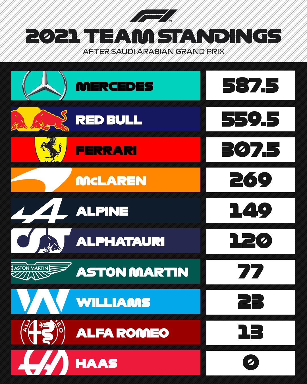 해밀튼이 제다에서 우승과 함께 패스티스트 랩 1포인트를 추가로 챙기면서 드라이버스 챔피언십은 동점이 됩니다. 9라운드 오스트리아에서 32포인트차까지 벌어졌던 걸 다 따라잡아 올라왔군요. 챔피언십을 가져가는 드라이버들에게는 그 시즌에 <그런데 이걸 해 냄> 순간이 있게 마련이라 생각하는데 - 2020시즌 실버스톤에서 타이어 셋으로 우승한 해밀튼이라든지 말이지요 - 이 날 제다의 해밀튼도 상당했네요. 메르세데스는 컨스트럭터스 챔피언십 1위에 보다 가까워집니다. 그래서인지 포디움에 팀 트로피 받으러 함께 올라간 건 스포팅 디렉터 론 메도우스 씨.... 진짜 RBR이랑 싸우고 싶구나, 하는 생각이 들기도 했답니다.