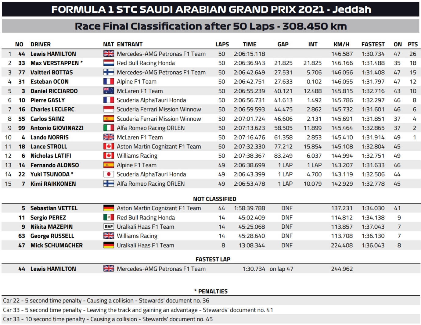 L43/50 해밀튼이 베르스타펜을 추월하면서 레이스 리드. 보타스가 포디움에 가길 바랐으나 VSC들 때문에 남은 랩 수가 너무 적었습니다. 프론트윙 망가진 차로 L46/50 해밀튼이 패스티스트 랩 기록. 해밀튼의 레이스엔지니어 보노는 연석 조심하라는 팀라디오를 보냈습니다. 타이어가 아슬아슬할 때기는 했지요. 베르스타펜도 체커드 플랙 받고 싶다면 페이스 조절해야 했을 거고요(하드 대 미디움임을 고려합시다). 체커드 플랙, 우승은 메르세데스의 해밀튼, 2위는 RBR의 베르스타펜. 그리고 마지막 랩의 마지막 순간에 메르세데스의 보타스가 알핀의 오콘을 추월하면서 포디움 남은 한 자리를 가져갑니다. 역시 Q3 100연속 진출에 빛나는 무민, 믿고 쓰는 핀란드 드라이버. 피니시 라인에서 p3 가져가는 모습 멋졌습니다.