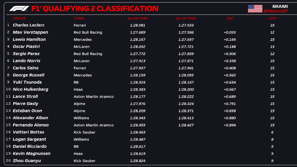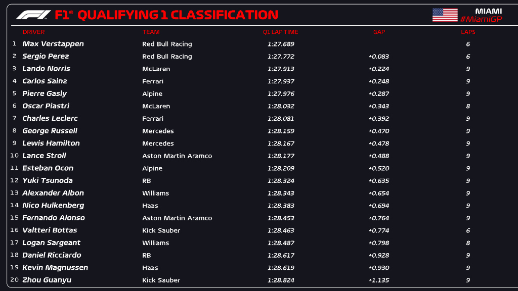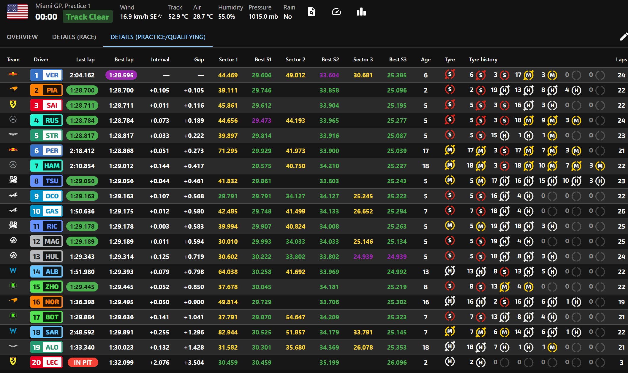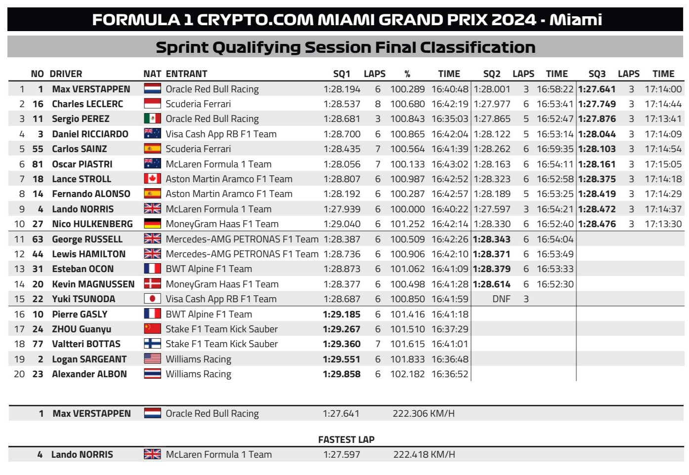 스프린트 퀄리파잉은 페이스도 페이스지만 전반적으로 운빨;이 좀 좌우한 면이 크지 않았나 싶은 느낌이었습니다. 애초에 비 안 오는 이상 스프린트 퀄리파잉은 타이어 사용도 미디움/미디움/소프트로 제한이 되다 보니 좋게 말해 예상가능하고, 나쁘게 말해 뻔한 세션이 되기 쉽긴 합니다. 이번 마이애미에서도 오버스티어 겪거나 벽 살짝 긁다시피하거나 한 드라이버들 꽤 있었지만 기록이나 순위 문제는 정말로 그 약간의 차이에서 갈리게 마련이라서요, 원래 한 바퀴 기록 승부는 남들보다만 아주 약간 빠르면 되는 것이기도 하고. 맥라렌은 업데이트 대성공인가?! 하고 아주 약간 저를 기대하게 만들었는데 - 이 시점까지 업데이트 적용 정도는 거칠게 말하면 노리스 100 피아스트리 50, 성공적이라 판단하면 다음 GP부터 피아스트리도 100이라는 모양이어서 - 딱 SQ2까지였고 SQ3 소프트 페이스는 매우 물음표였습니다. 그냥 타이어 온도 문젠가? 하지만 미리 나와서 돌려보기엔 연습주행때나 뭐나 소프트 너무 <딱 한 방>상태였던 것 같아서요. 스프린트 주말이라 타이어 물량이 넉넉하기는커녕 평소같은 주말보다 더 빡빡하면 빡빡한 쪽이기도 했고요. 메르세데스의 p11, p12 매우 아쉬운 한편 업데이트에 조심스러울 수밖에 없었을 것도 이해가 갑니다. RBR은 좀 처지나...? 싶다가도 귀신같이 다시 리더보드 꼭대기가 자기들 자리라는 듯 올라가는 거 보면 잘 만든 차는 중요하군 하는 생각을 다시금 하게 되더라고요. 한편 작은외양간 쪽은 츠노다 p15 리카도 p4, 운 작용도 했겠지만 리카도 섀시 교체가 영향이 있는걸까 싶기도 합니다? 하여튼 결과만 놓고 보면 여기저기 재밌어요. 그러나 이 재미가 레이스까지 이어질 수 있을지는? 이것만으론 안 된다 이 뻐킹시차를 감수해가며 볼 만한 무엇이기는 아직은 쉽지않아뵌다 ........... 상태였으며. 그렇게 시작한 스프린트는: