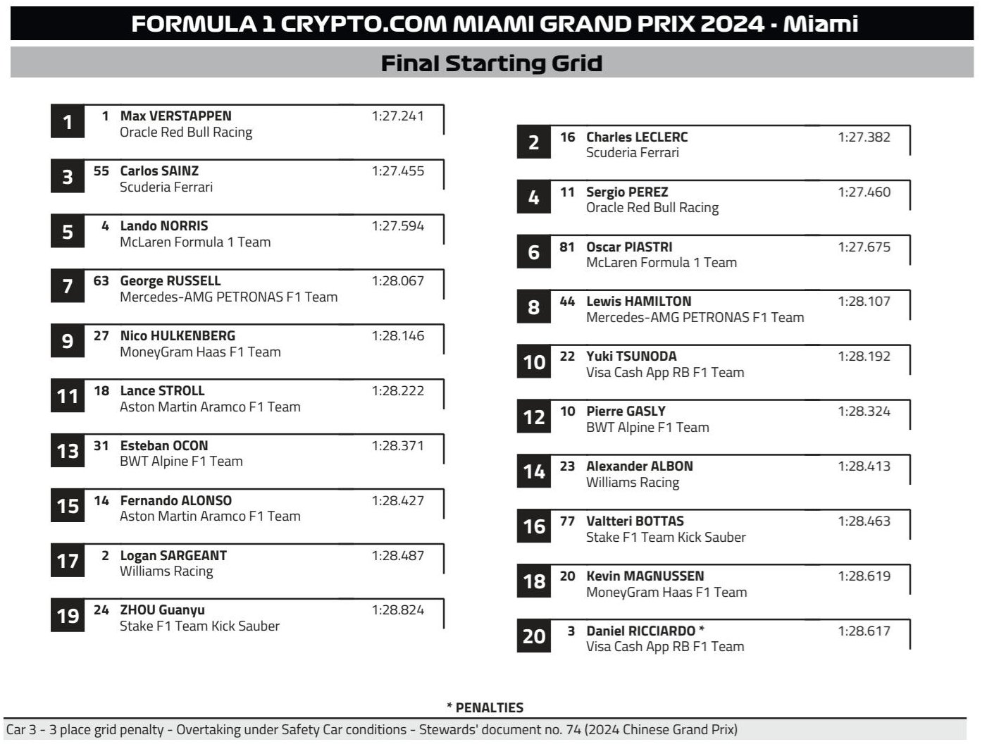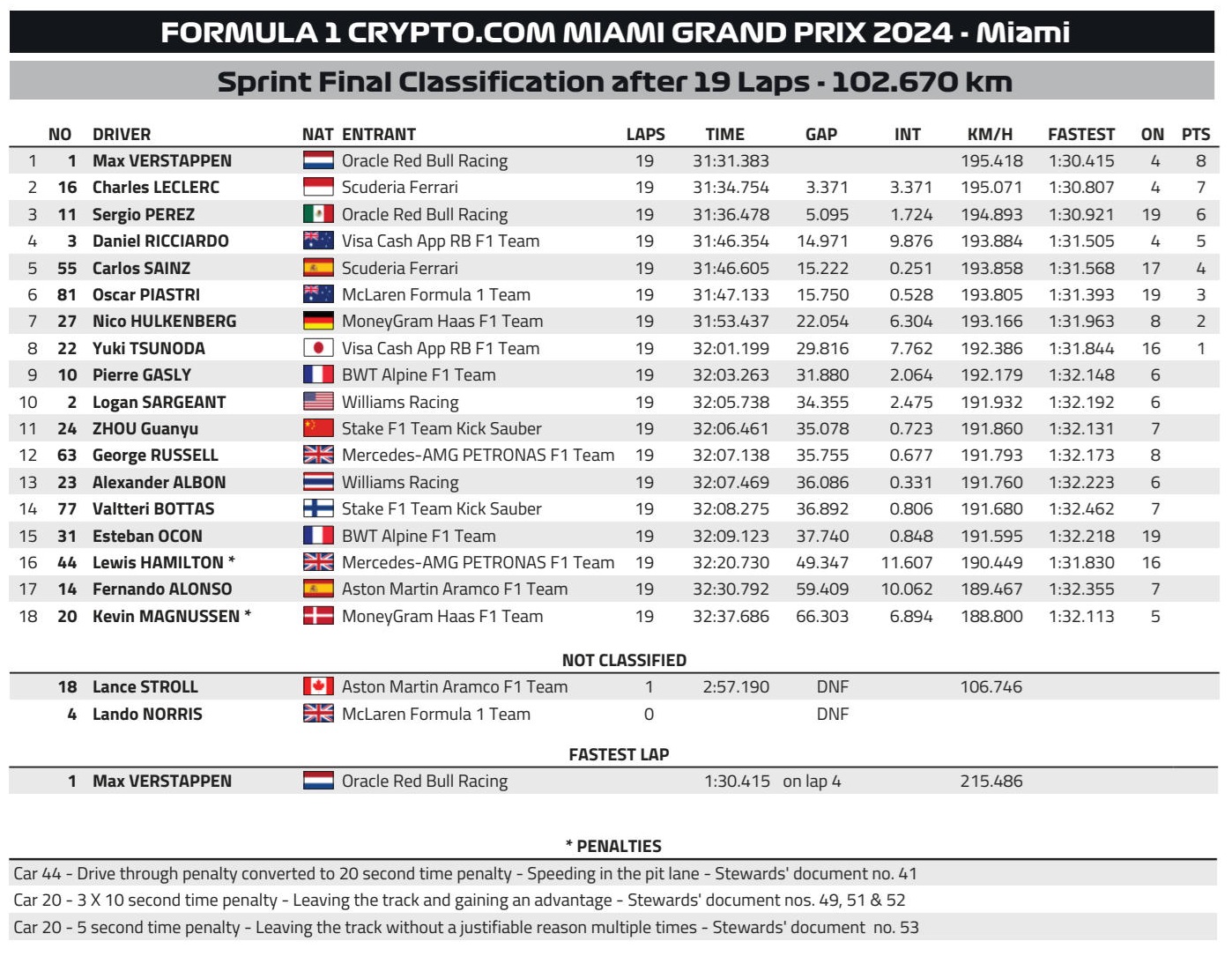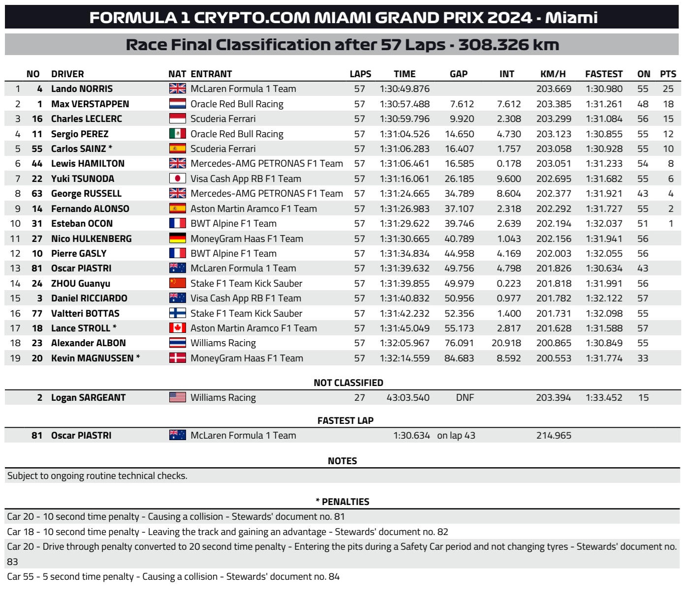보타스 3그리드 페널티, 알본 셋업 변경 후 피트레인 스타트입니다. 첫 랩에 날아가버린 노리스가 너무 아쉬웠던 한편 ... 첫 랩 세이프티 카가 영향을 미쳤다면 미쳤겠어요, 스프린트였어서 특히 더. 하스의 케빈 마그누센에 굉장한 타임 페널티들과 벌점들이 쌓였습니다. 결과만 놓고 보면 마이애미 2024 스프린트도 또 그 외양간과 그 마굿간(중 한 대) 이렇게 top 3, 식이었는데 그 하스의 "팀 플레이"가 그만. 약간의 미심쩍은 부분들도 있기도 했고요. 기록 아래에 팀별 메모를 덧붙여둡니다.